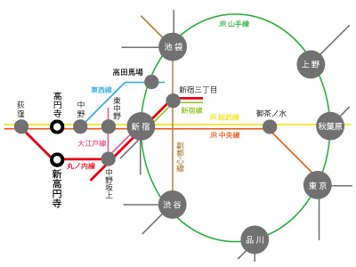 新宿駅から「荻窪行き」に乗車、新高円寺駅まで約10分。