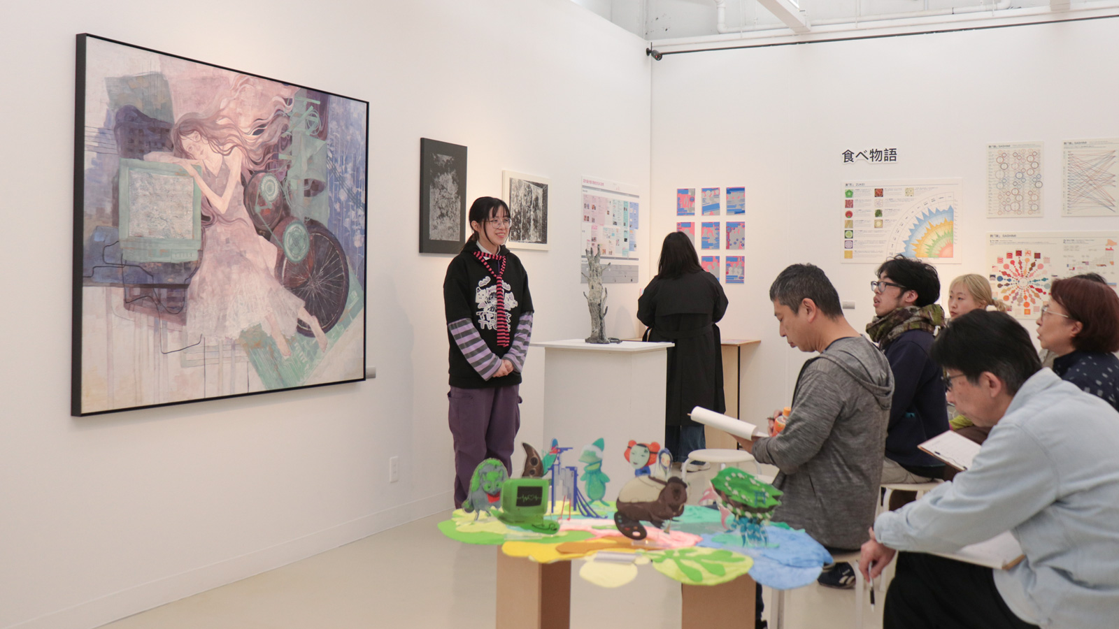 研究科生の個々の研究制作では、グラフィックデザイン、プロダクトデザイン、キャラクターデザイン、ソーシャルデザイン、イラストレーション、マンガ、アニメーション、絵画、版画、立体など、多様な専攻分野から新たな可能性を追求してきました。独自の視点から生まれる唯一無二の美意識や世界観、その形成に向けた試行錯誤を展示にて味わうことができました。