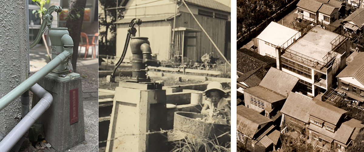 左:現在のアサビの中庭にある汲み上げポンプは1952年当時からのもの