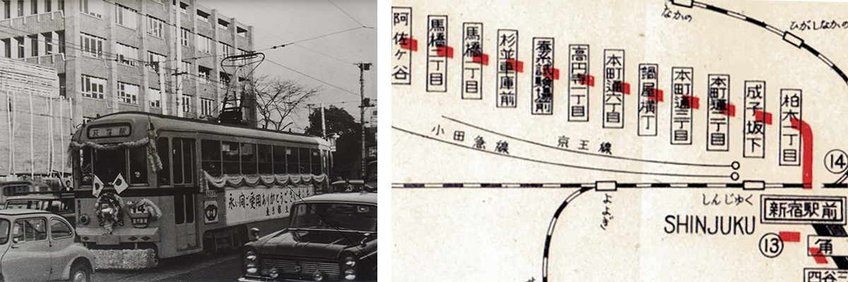 左:都電杉並線の最終日に別れを告げる装飾電車