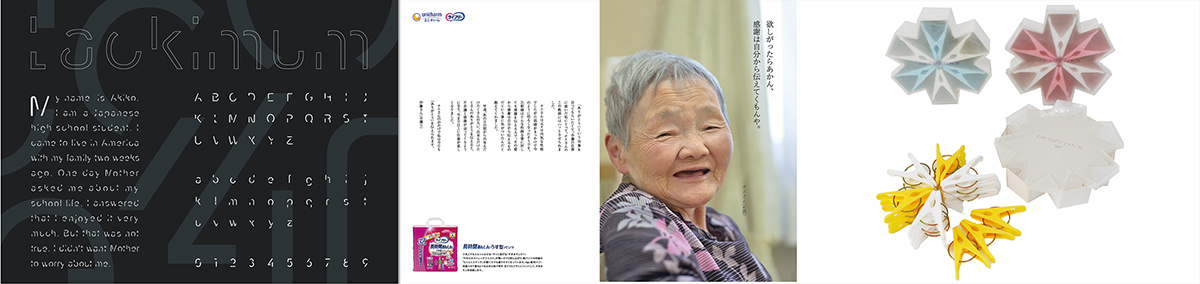 課題作品 左から:オリジナルフォント/紙おむつの雑誌広告/洗濯バサミのためのパッケージ