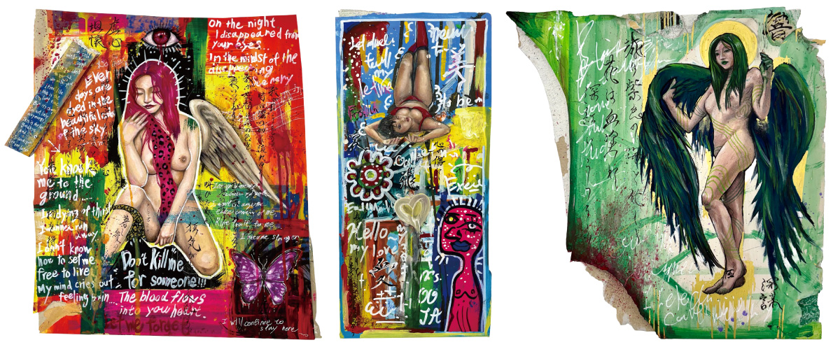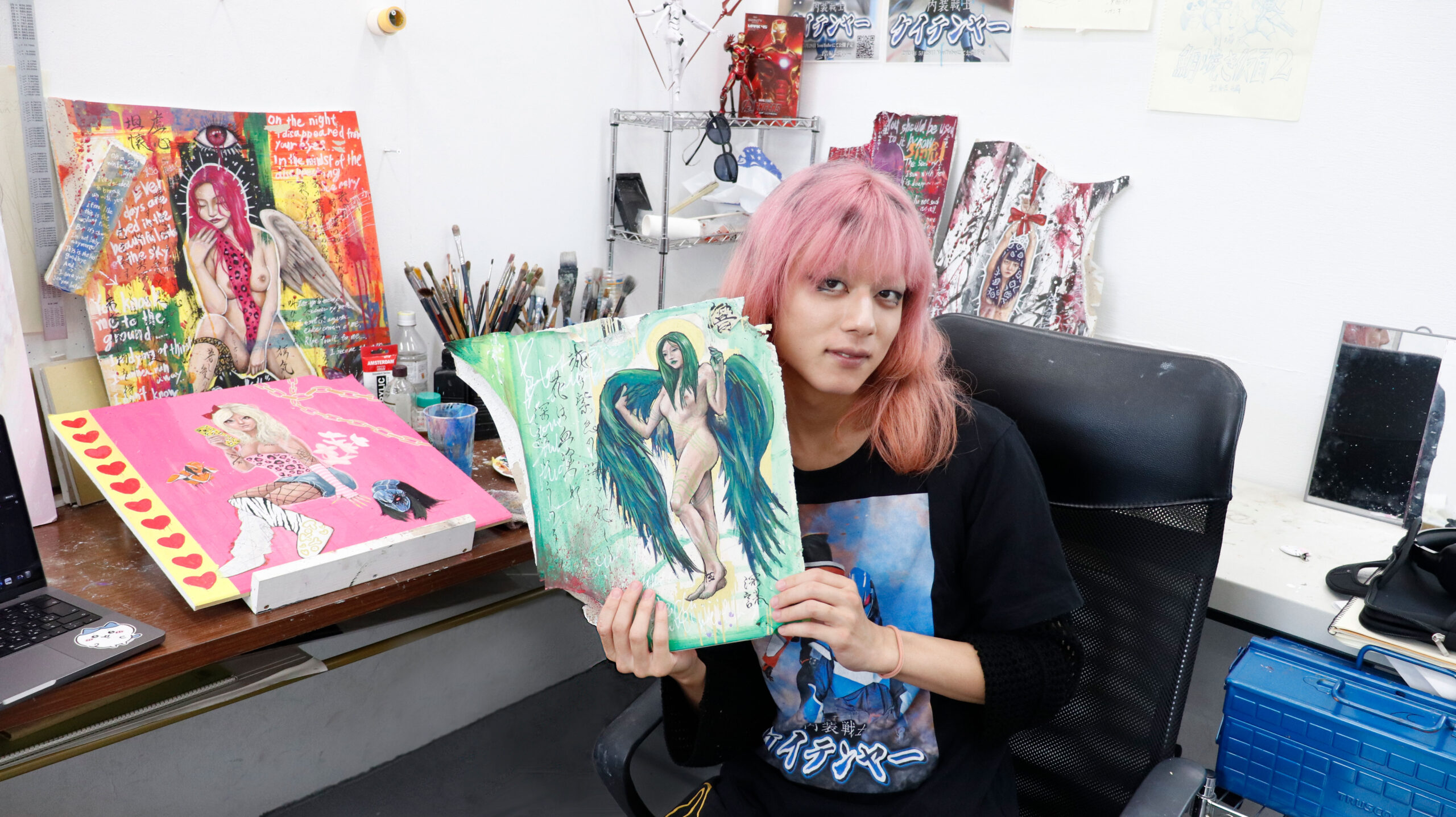 私の作品は、一般的なキャンバスではなく石膏ボードに描いています。内装の仕事でよく扱っていた素材で、自然と親しみがありました。硬くて丈夫なのに割れやすい、その“強さと繊細さ”の両方を持つところに惹かれ、自分自身とも重なる気がしています。