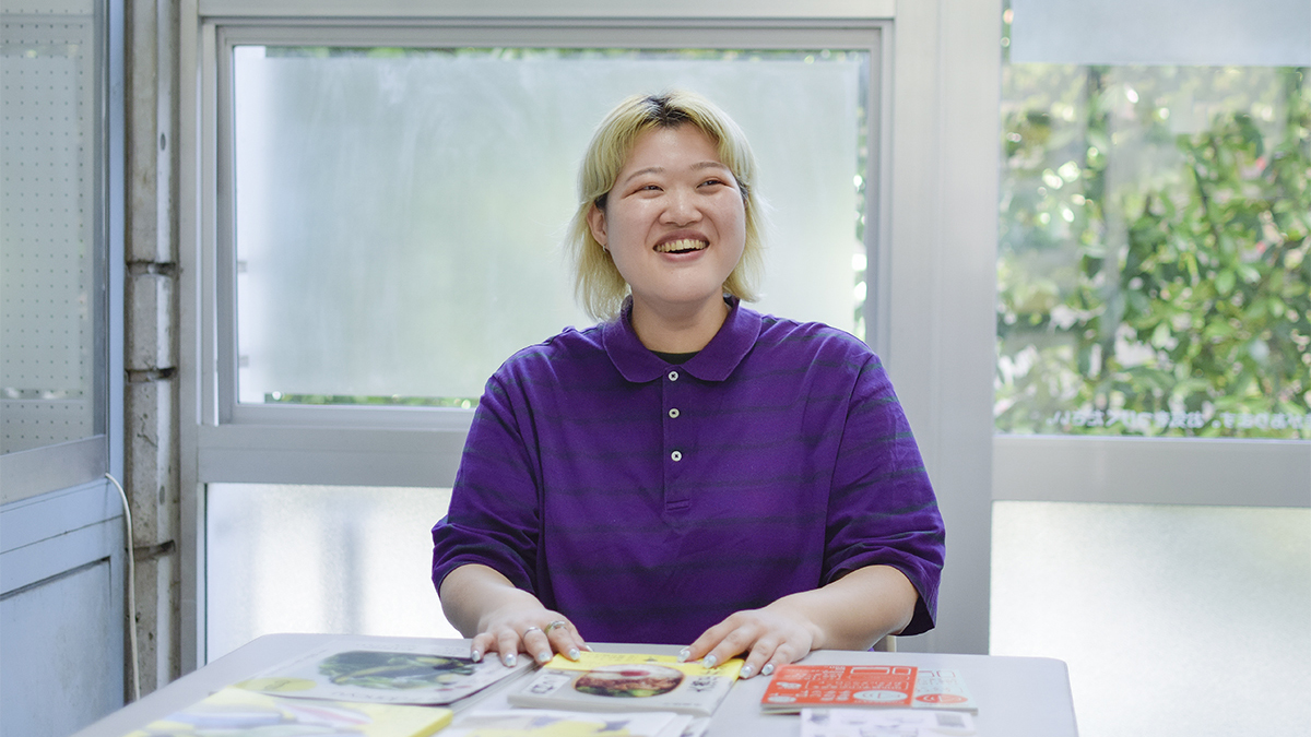 働いてお金がたまってきた時に「デザインを仕事にするために学校にいこう!」と思いました。以前、好きだったイラストレーターのくぼあやこさんが、一度働いてからアサビで学んだということをプロフィールで読みました。年齢を重ねてから入学してプロになる人もいるのだと知り、そういう学校が自分に合っているかもしれないと、アサビの説明会に参加しました。その時は美術やデザインで何をしたいのか具体的な目標はまだ決まってなく、1年生の時に幅広いクリエイティブの基礎を学ぶと聞いて、今の私にぴったりだと感じて入学を決めました。当初はクラスメイトと年齢差もあるので友達は必要ないと考えていました。「とにかく学びたい!」という気持ちが強かったのです。ある授業でソフトウエアの使い方が全く分からなかったとき、同じクラスの年下の子が詳しく教えてくれました(笑)。実際には友達もできて、在学中に年齢差を感じることはなく、周りと楽しく過ごしていました。