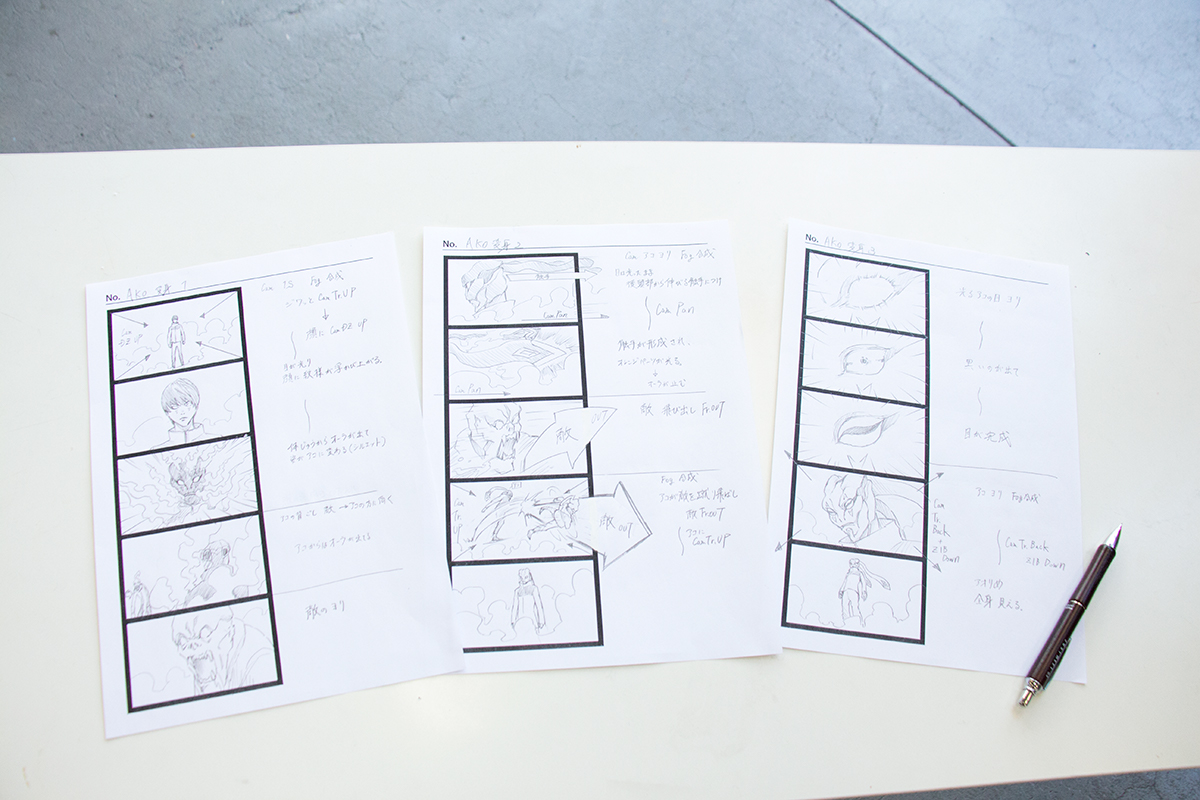 仕事の絵コンテは出せないからと、今回の対談のためにオリジナル作品、AKOの絵コンテを描いてきてくれた武藤さん。主人公の変身シーケンス。