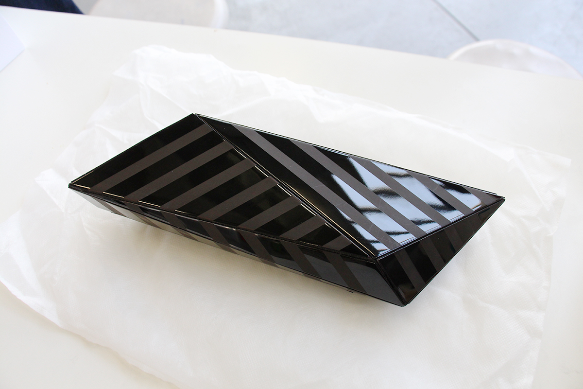 渡邉さんの勤める株式会社N and R Foldings Japanで制作された立体物から平面になるというコンセプトのクラッチバッグ「ORISHIKI」