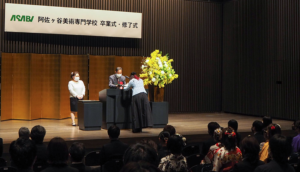 証書授与式のあとに、本校の甲斐校長と、学校法人阿佐ヶ谷学園の三輪理事長が卒業生・修了生に祝辞を送りました。つづいて卒業制作・修了制作の優秀賞と同窓会賞の表彰を壇上にておこないました。
