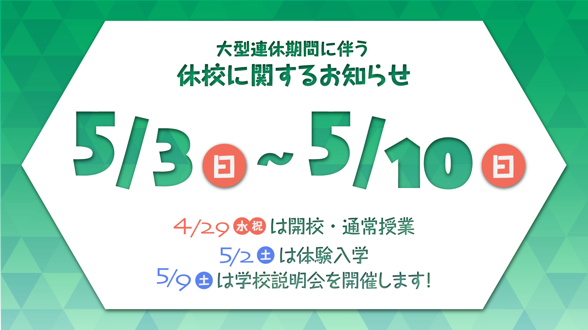 大型連休に伴い、5月3日(日)〜5月10日(日)は休校期間のため、学校業務を停止いたします。